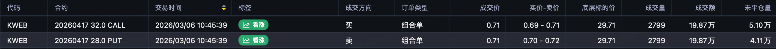 Bullish flows continue: buy 32 call $KWEB 20260417 32.0 CALL$  + sell 28 put $KWEB 20260417 28.0 PUT$  — 20k+ contracts.