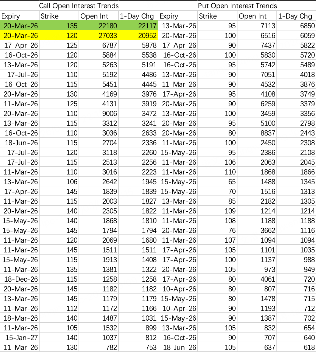 Call spread holders rolled up and in: closed the April 120–135 spread, reopened March 20: buy 120 $USO 20260320 120.0 CALL$ , sell 135 $USO 20260320 135.0 CALL$ .