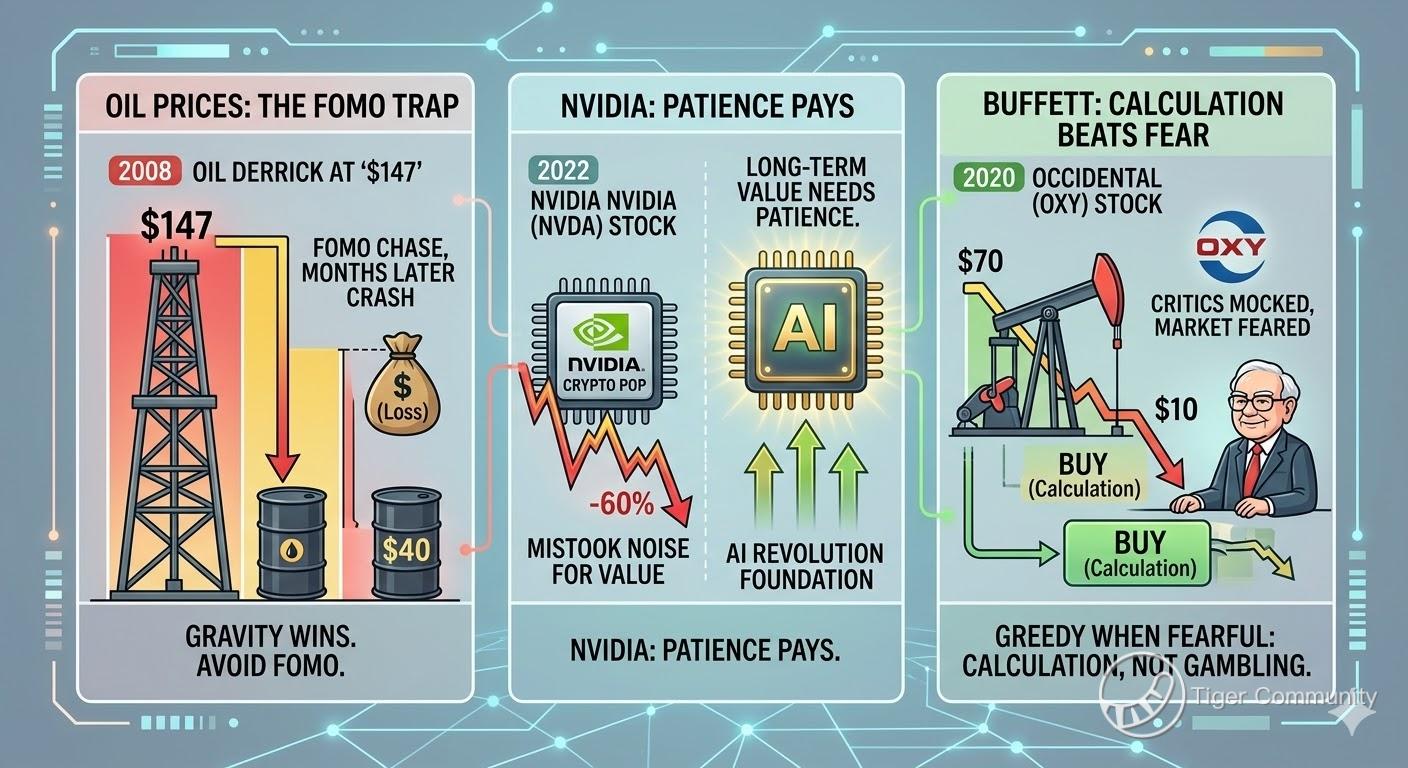 A few months later, the floor fell out. Oil crashed to $40. Those who chased the peak (FOMO) were left holding bags that took a decade to break even.