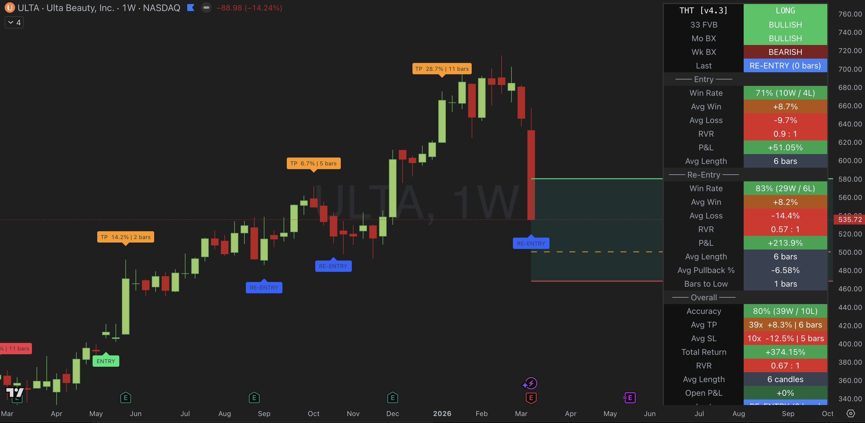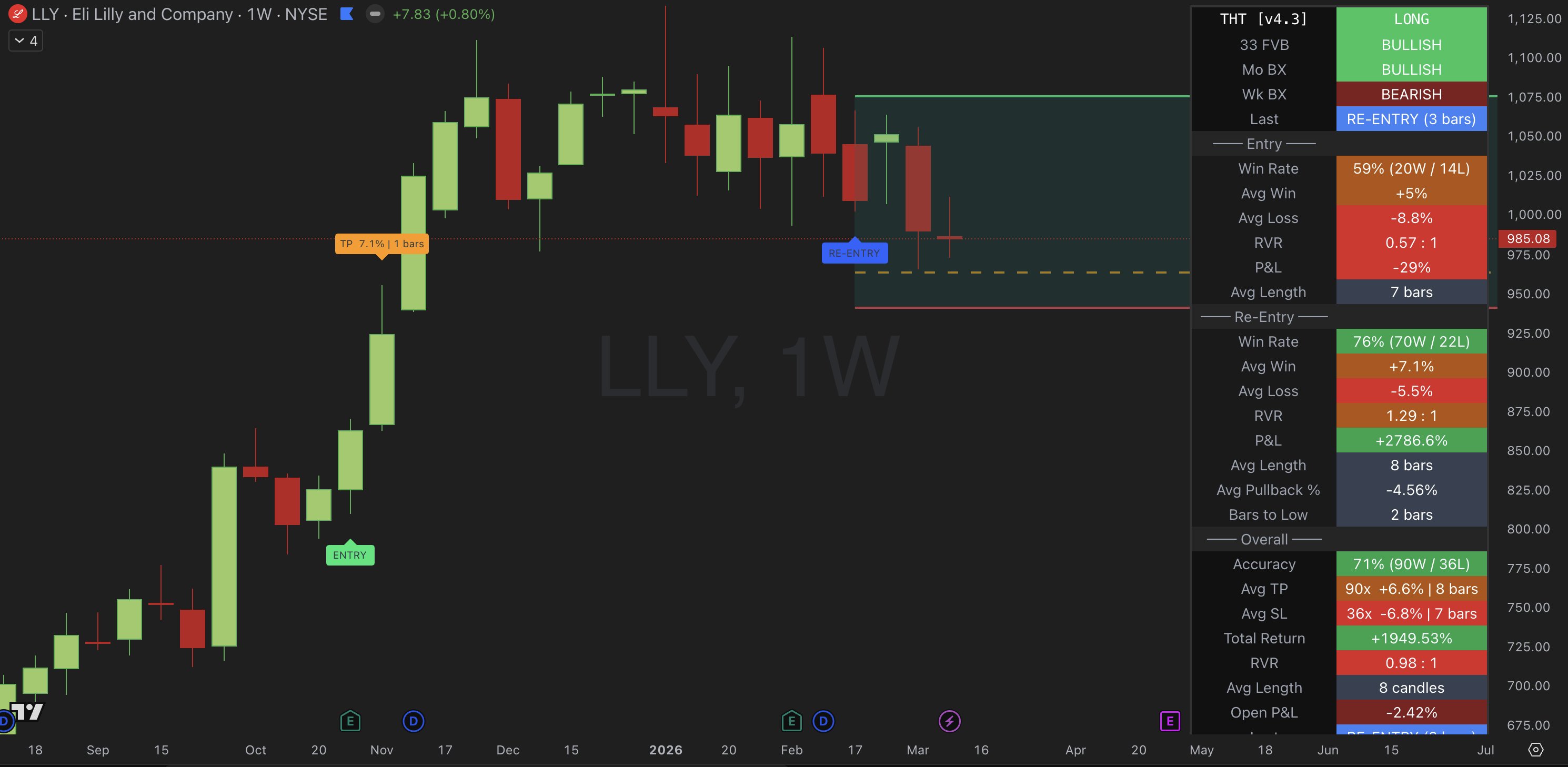When Re-Entry logic is met, price has rallied an average of 8.2% over 6–8 weeks.