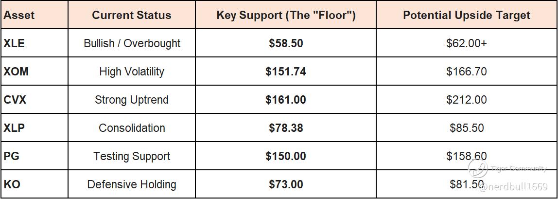 The Bottom Line: If you are looking for a "safe entry," the Energy stocks are currently showing stronger momentum, but are technically "stretched." Consumer Staples like PG and KO are sitting right on their floors, offering a potentially better risk-reward entry if you believe the $150 (PG) and $73 (KO) levels will hold through the end of the month.
