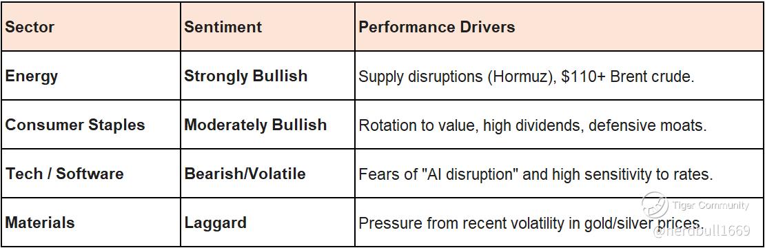 • Drivers: Investors are moving into Staples for their "moats" and high free-cash-flow conversion, which offer protection as tech and software stocks face pressure from both the war and "AI disruption" fears.