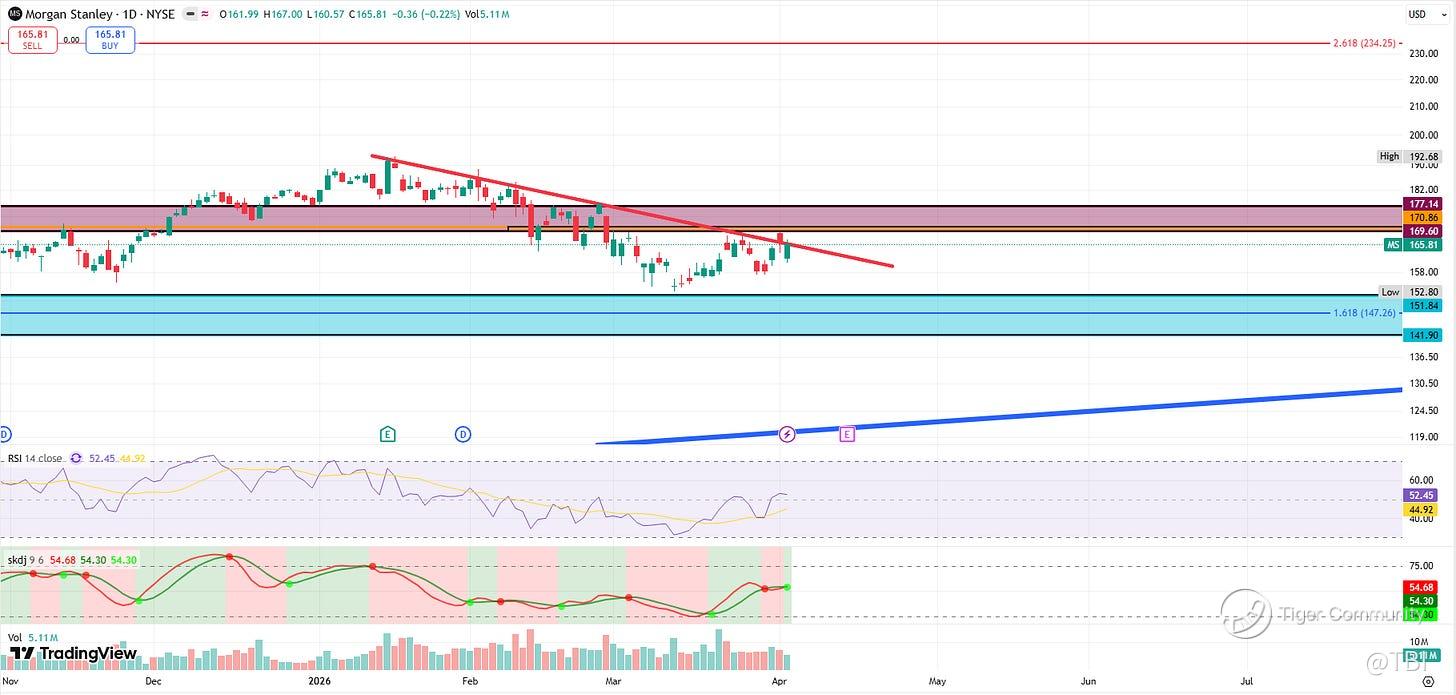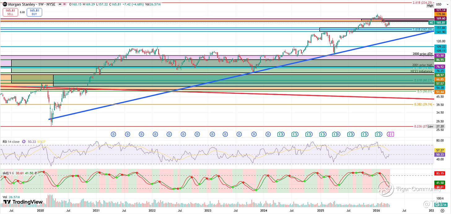 If MS breaks above the near-term resistance trendline, fills the 170-177 monthly imbalance and turns it into support, then it could possibly push back towards prior ATHs at 193.