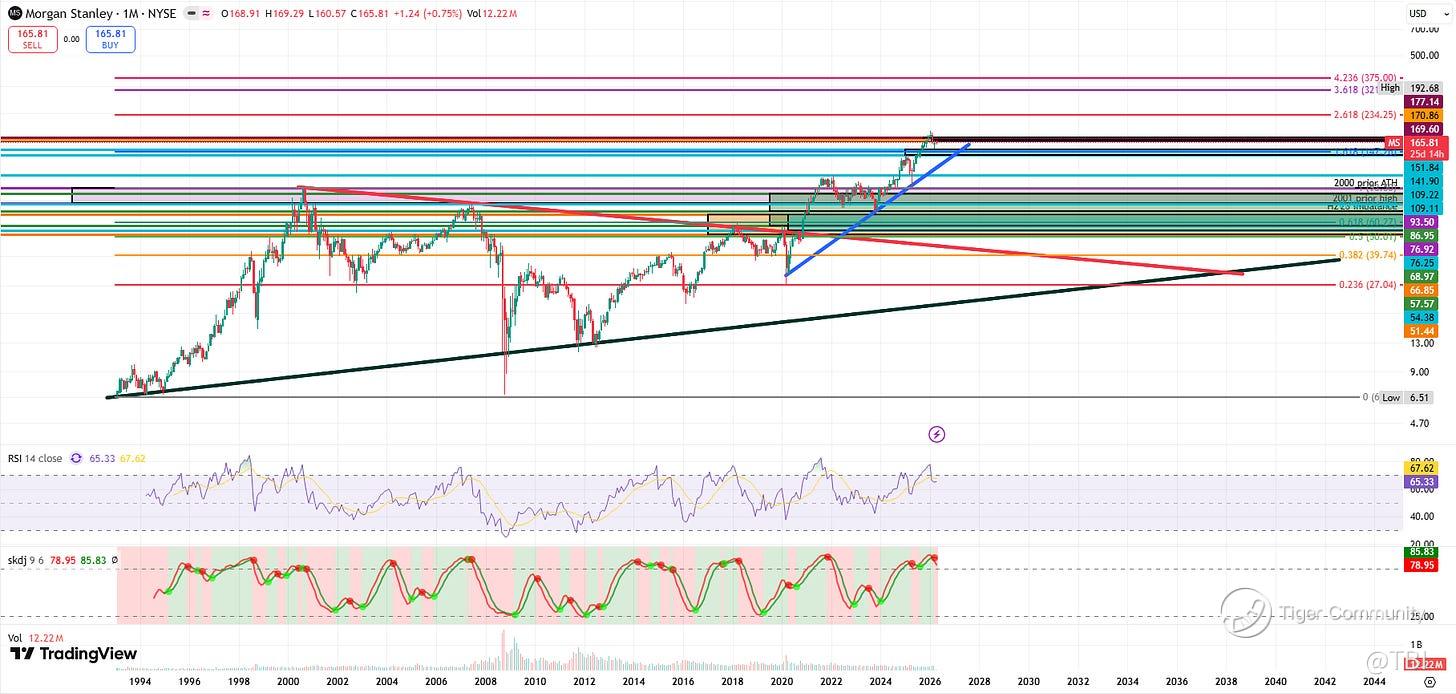 However, if MS were to reject this 170-177 area, or even the weekly-monthly imbalance confluence at 170-171, then it could push into the quarterly level at 151.84, where there is an unfilled quarterly imbalance at 142-152 and the 1.618 Fib at 147.26.