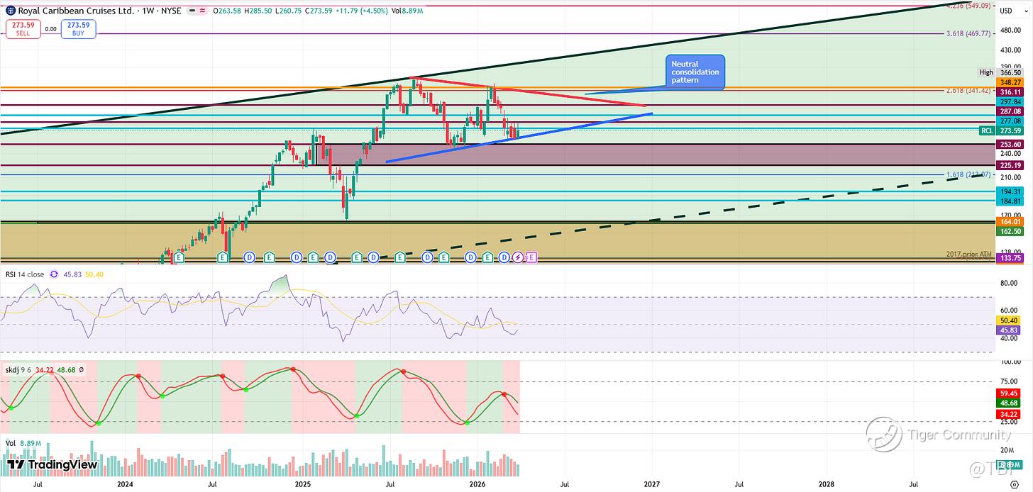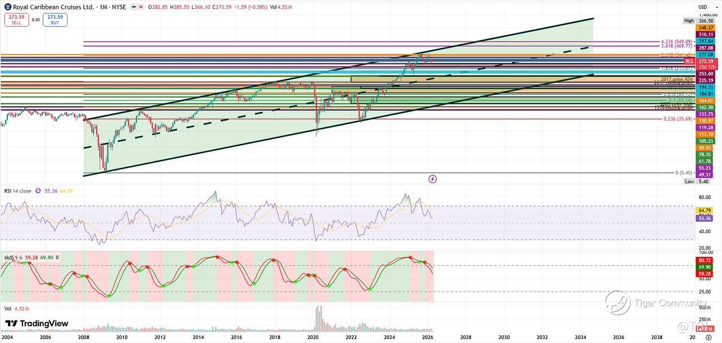 If RCL holds at blue support and reclaims the 277.08 level, it could attempt to reclaim the other monthly and quarterly resistances and push back into the red resistance trendline. If RCL breaks above 341.42 and turns it into support, then it could see price discovery into the next Fib level at 469.77. Despite all that's been discussed, there is still reason to be wary given the green channel rejection.