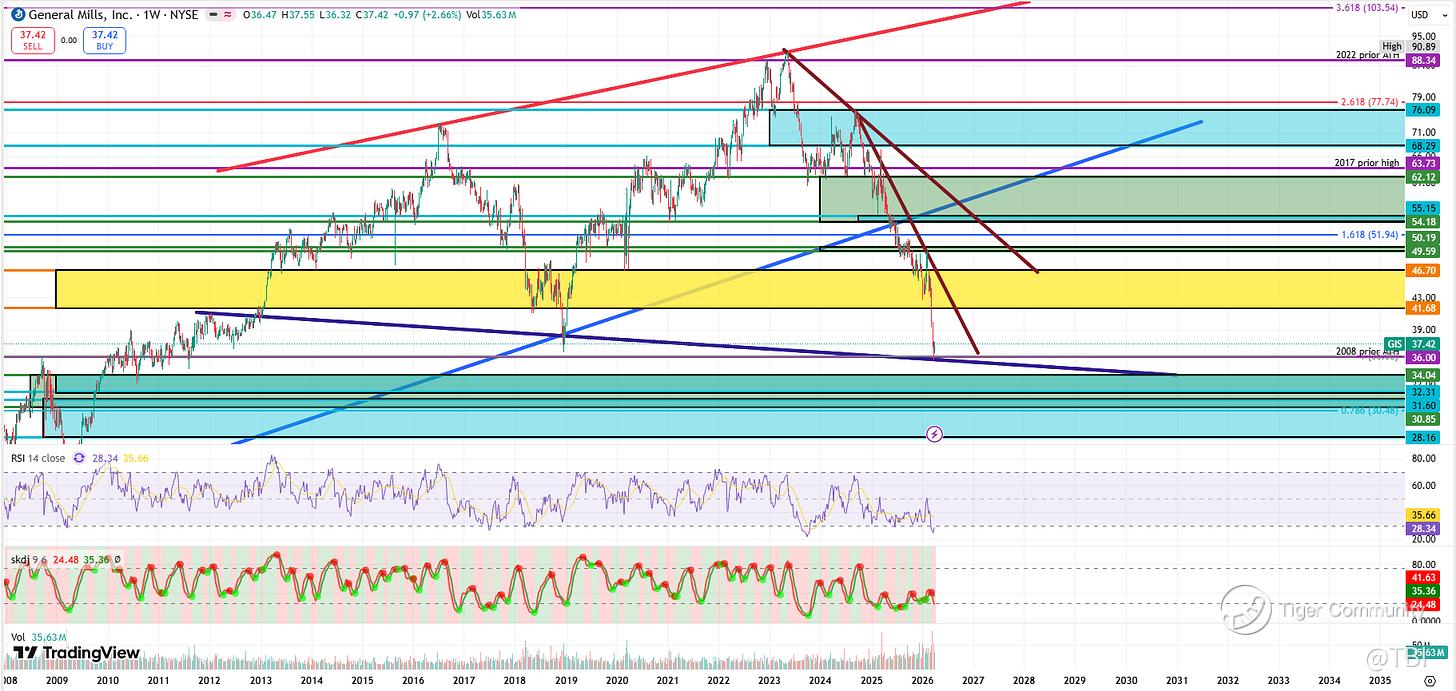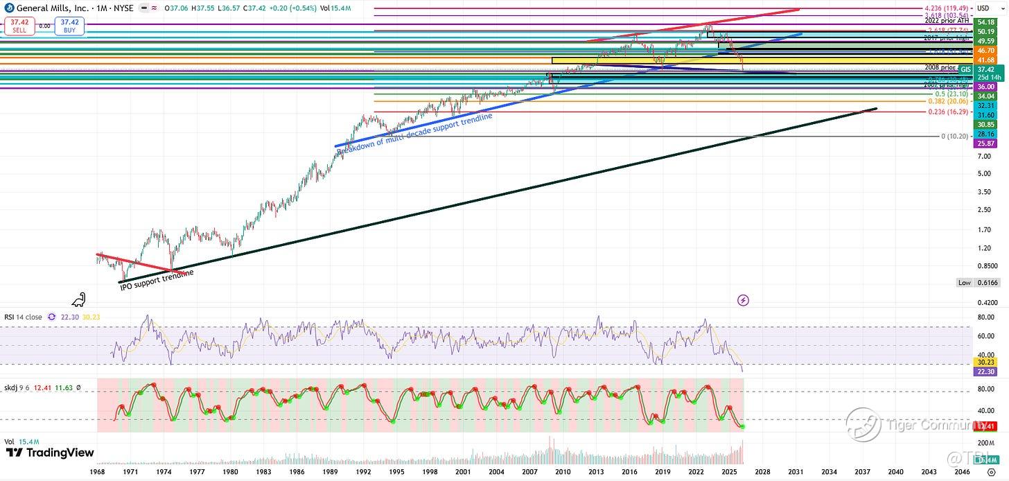 Following a breakdown below the multi-decade blue support trendline, GIS is back into its 2008 prior ATH at 36, with the monthly RSI at the lowest point in its entire history.
