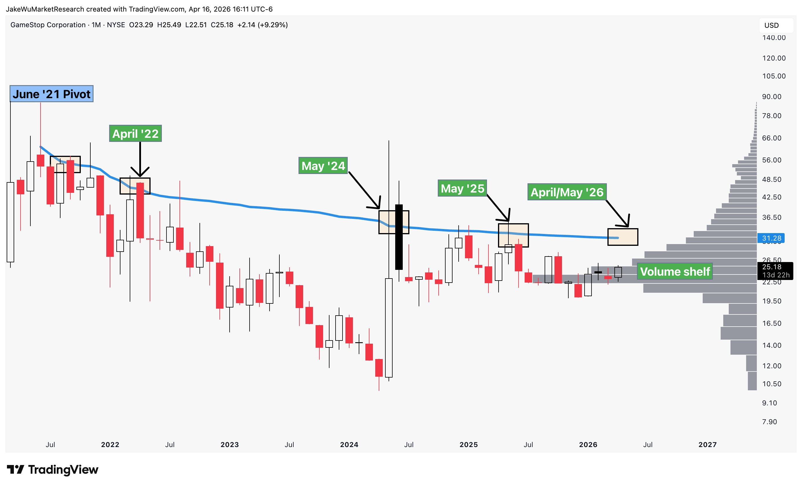 $GameStop(GME)$ Getting close to moving above the top of the volume shelf.