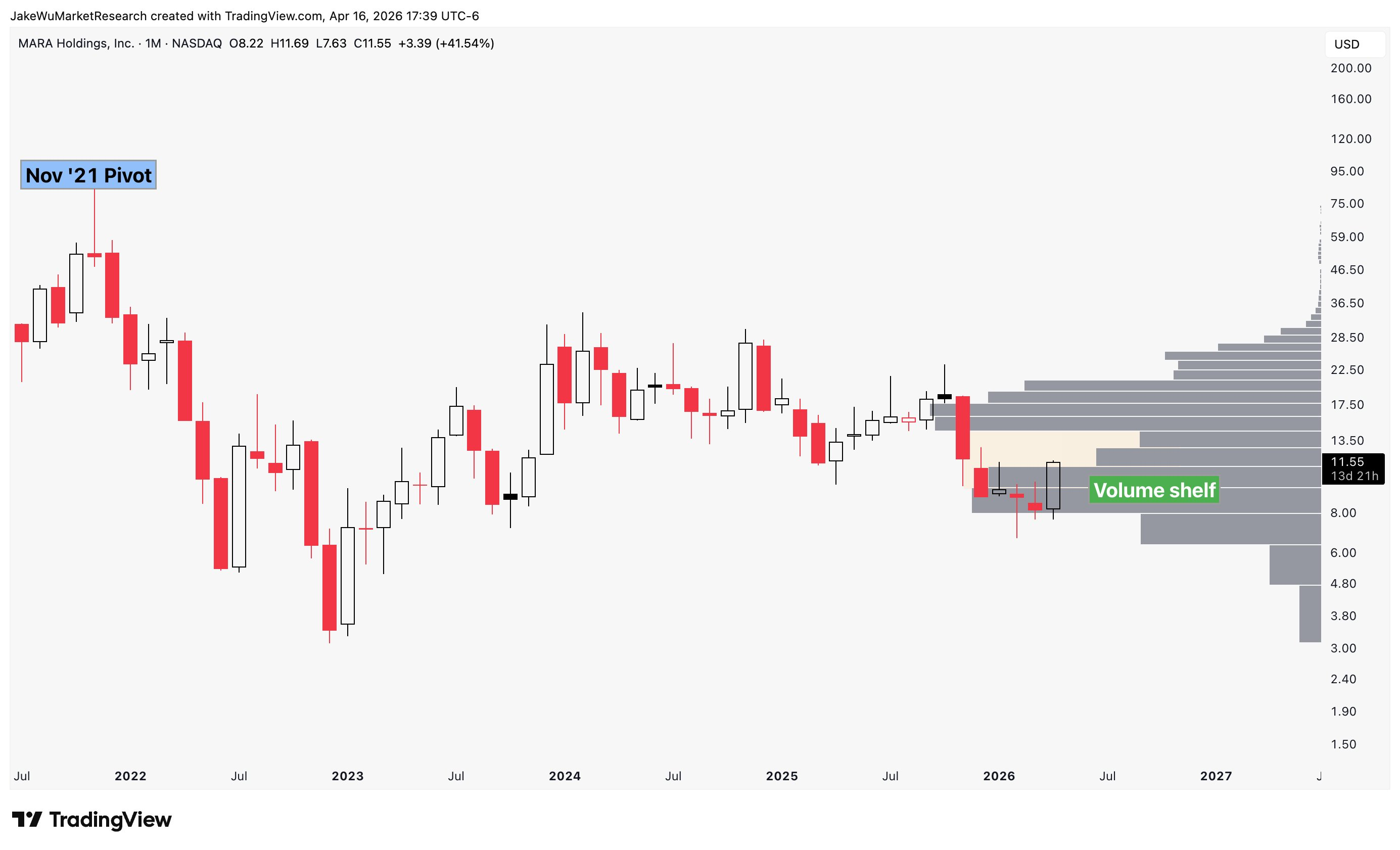 $MARA Holdings(MARA)$If crypto continues to catch a bid, an aggressive move through this volume gap, similar to what $TSLA did this week, would make sense. The volume gap goes up to $14.60.