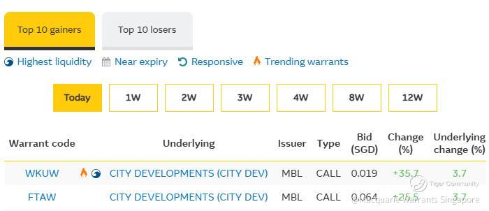 🏆Macquarie's two City Dev call warrants WKUW and FTAW are the top two best performing warrants this morning as of 1010AM