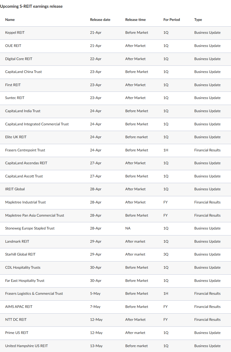A further 25 S-REITs have also confirmed that they will report their financial results or business updates between April 21 and May 13. Among them, four will report full-year financial results, two will report first-half financial results, and another 19 will provide quarterly business updates.