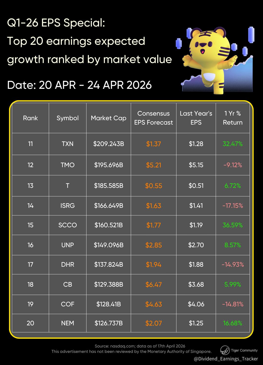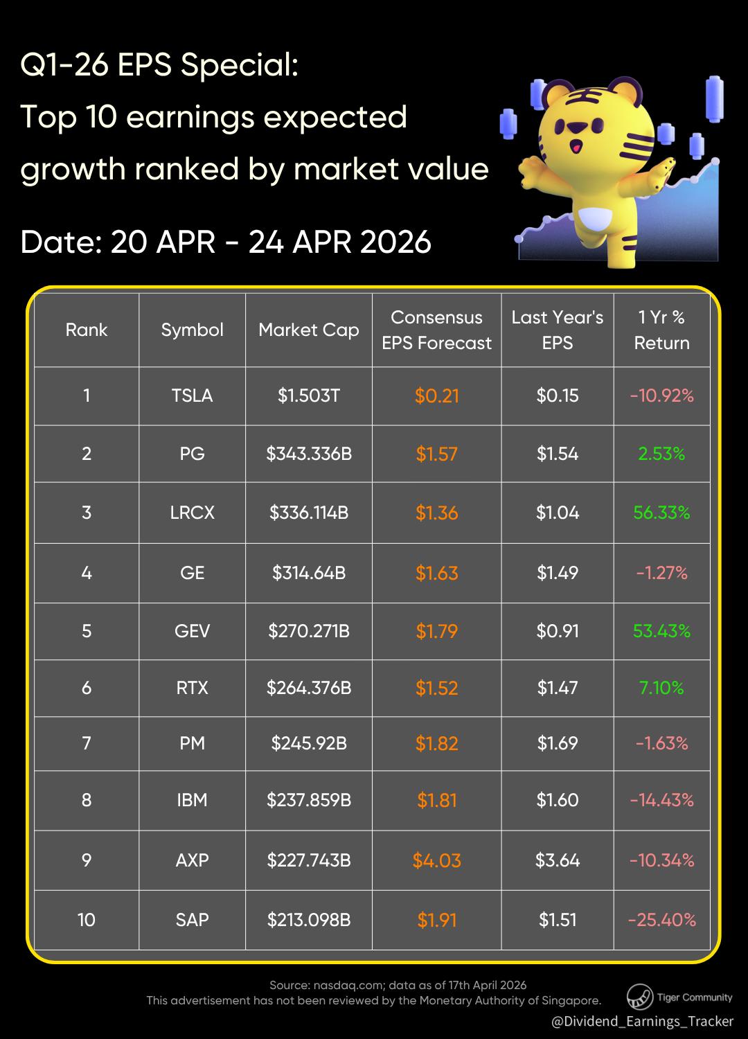On April 20 to April 24, $Tesla Motors(TSLA)$, $Procter & Gamble(PG)$, $Lam Research(LRCX)$, $GE Aerospace(GE)$, $GE Vernova Inc.(GEV)$, $RTX Corp(RTX)$, $Philip Morris(PM)$ $IBM(IBM)$ , $American Express(AXP)$ , $SAP SE(SAP)$ , $TXN$, $TMO$, $T$, $ISRG$, $SCCO$, $UNP$, $DHR$, $CB$, $COF$, and $NEM$ are expected to release their earnings, and consensus earnings per share forecasts are higher than data from the same period last year.