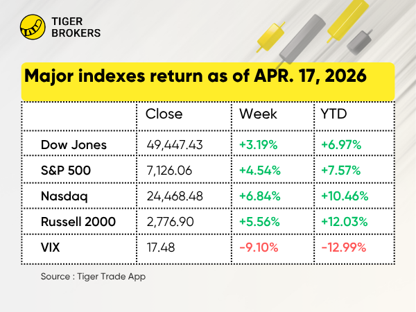 $S&P 500(.SPX)$ : The S&P 500 index advanced 4.54% and closed at 7,126.06 last week, as the fundamental driver came from a temporary easing of Middle East geopolitical risks, while blowout earnings from cloud infrastructure giants and resurgent crypto sentiment drove a broad-based rally across growth and cyclical sectors