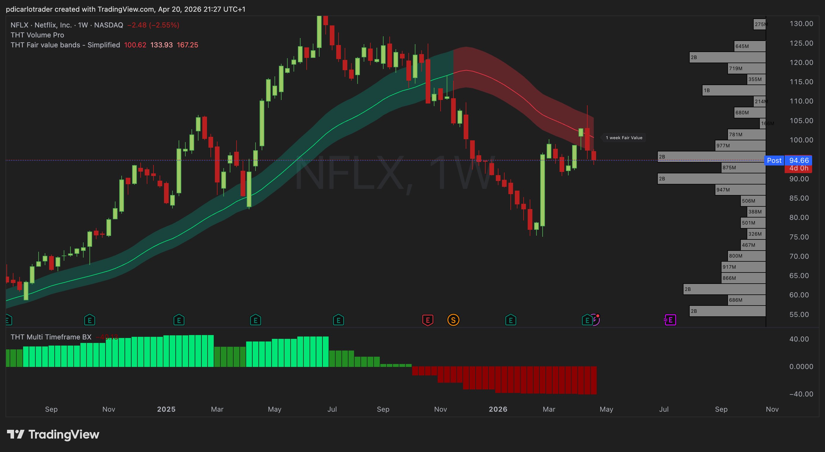 $NFLX rejected at the 33 Fair Value Band and Monthly BX is still dark red. 🔴