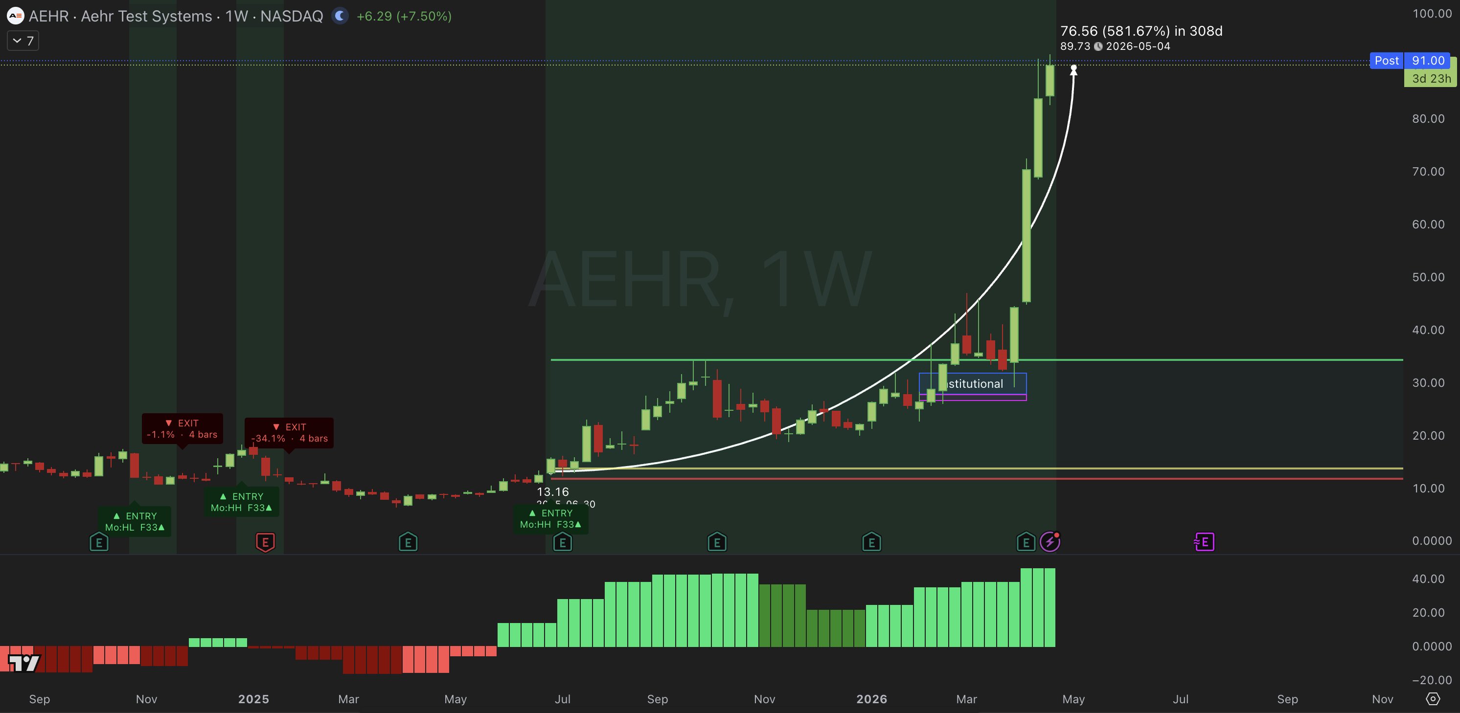 Meanwhile, TSLA sits at a critical inflection point, and late-cycle names like AEHR are increasingly extended.