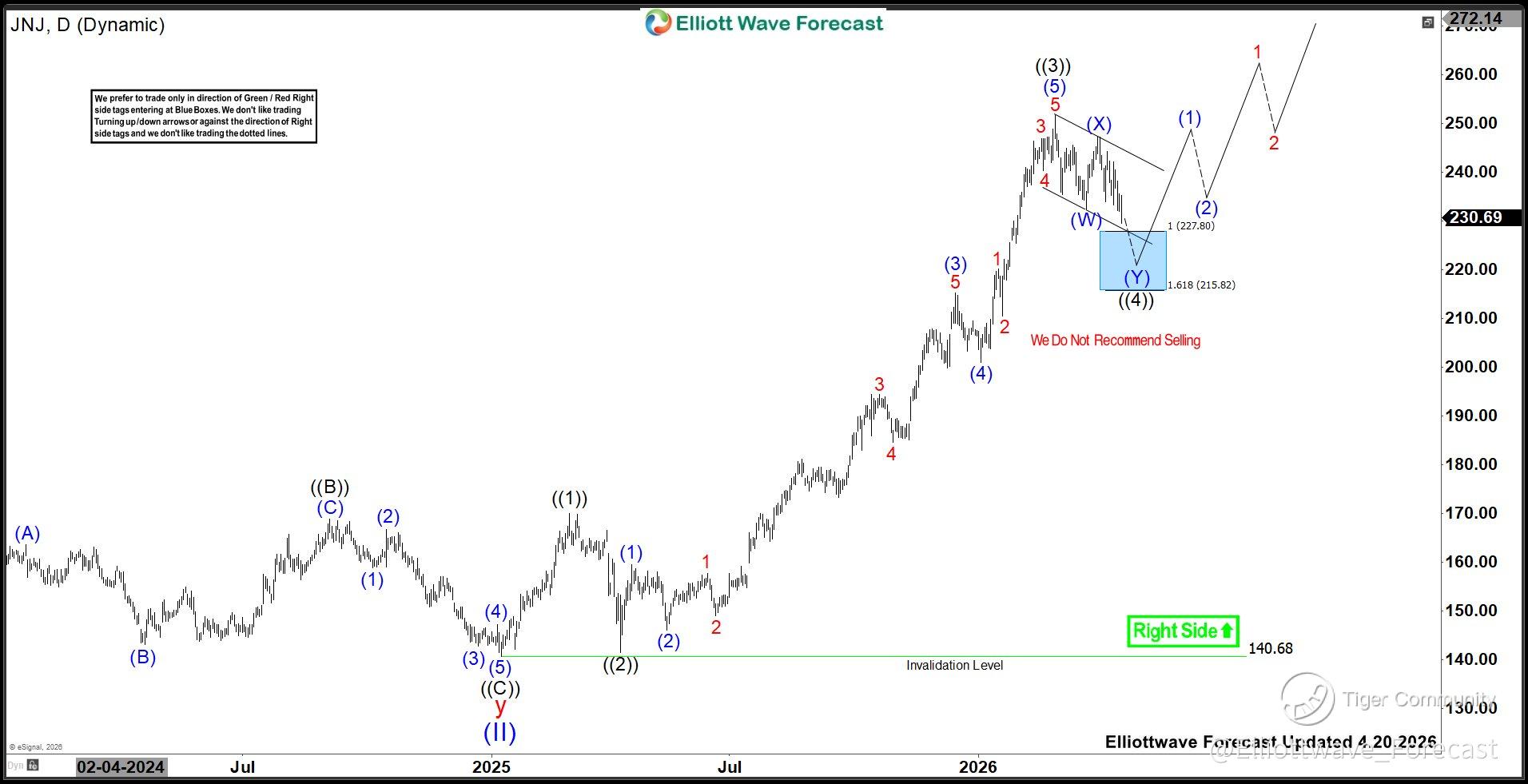 The JNJ favors rally in bullish sequence from January-2025 low. Currently, it favors double correction lower in ((4)) & find support between $227.8 – $215.82 area to rally higher. Buyers will enter into that area for at least 3 swings bounce.