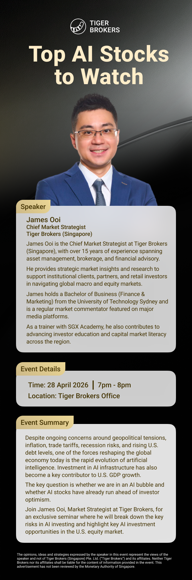 Join me for the seminar “Top AI Stocks to Watch” on 28 April at our Singapore office.” @Tiger_James Ooi