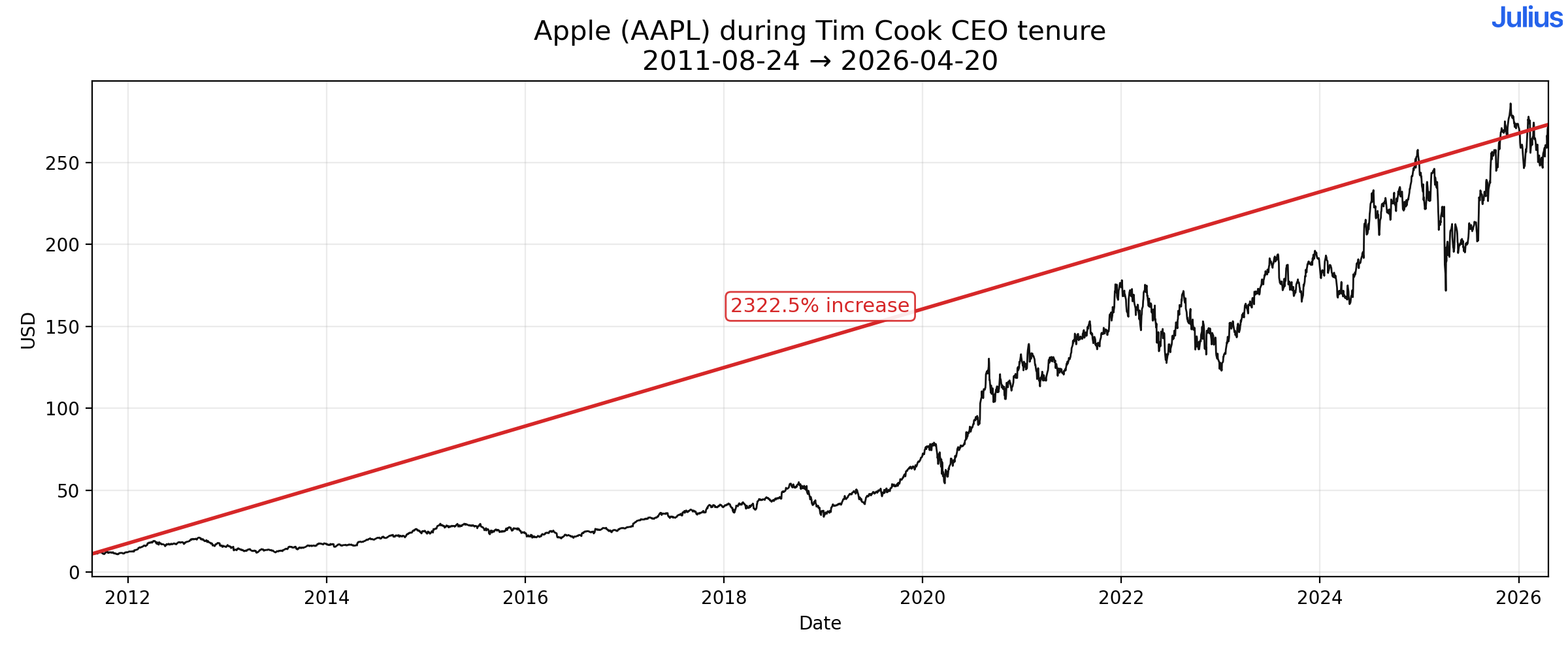 If you had gone all-in on Apple back then, you would have earned a 23x return. That is Cook’s most powerful report card.