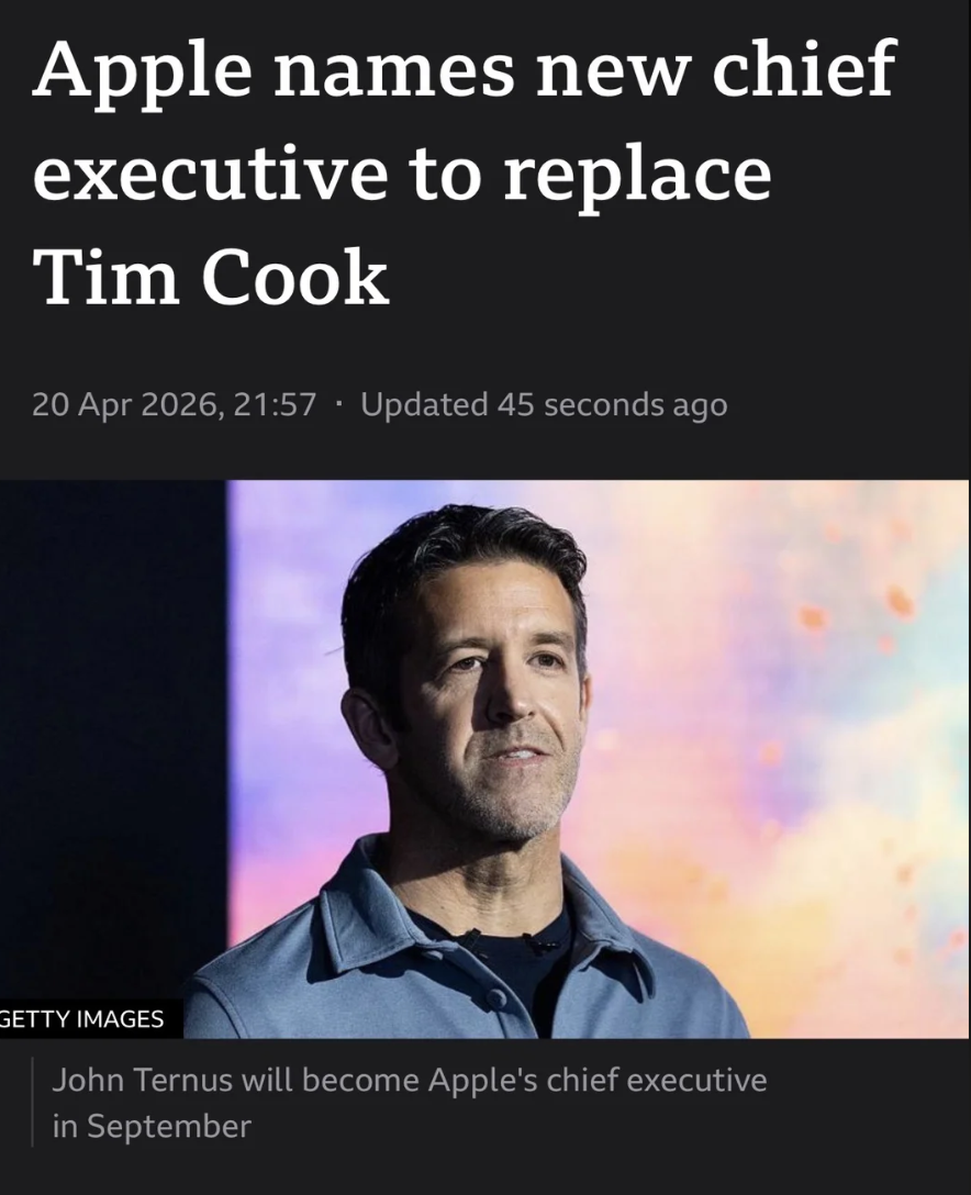 Ternus is not some parachuted-in star executive. He joined Apple in 2001, four years after graduating from the University of Pennsylvania with a degree in mechanical engineering, and has spent nearly his entire career there. He was promoted to Vice President of Hardware Engineering in 2013, and entered Apple’s top leadership team in 2021, reporting directly to Cook.