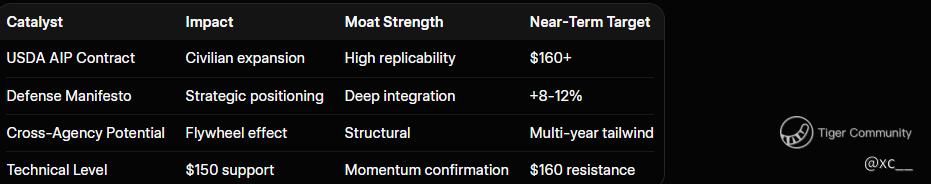$Palantir Technologies Inc.(PLTR)$ Palantir climbed 4.56% to $152 today after landing a major AIP contract with the USDA and simultaneously dropping its Defense Manifesto, which redefines its role as the central nervous system of the U.S. government AI ecosystem. 😤 This dual catalyst extends Palantir’s federal footprint beyond traditional defense into civilian agencies, with the USDA deal serving as a blueprint for replicable AI deployments across departments. The manifesto lays out how Palantir’s platforms can integrate with every layer of national security and public sector operations, turning digital transformation tailwinds into a structural moat that competitors struggle to match. With shares reclaiming momentum and $150 now acting as firm support, the big question is how deep this government AI moat actually runs — and whether this move marks the start of a multi-year dominance phase or simply another headline-driven pop. Emerging markets are watching the federal playbook closely, with Asia’s smart-city AI initiatives pulling inflows on dollar dips to 94 and Latin America’s agricultural digitalization adding 8% demand for similar platforms. Let’s break down the USDA win, unpack the manifesto’s implications, and spot if Palantir’s moat is as unbreachable as the price action suggests in 2026. 📉⚡