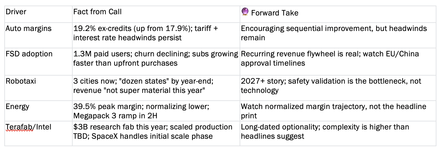 Facts: Energy hit a record 39.5% margin (with one-time benefits). Terafab is a $3B research fab using Intel 14A, with SpaceX handling scaled production โ timeline is years.
