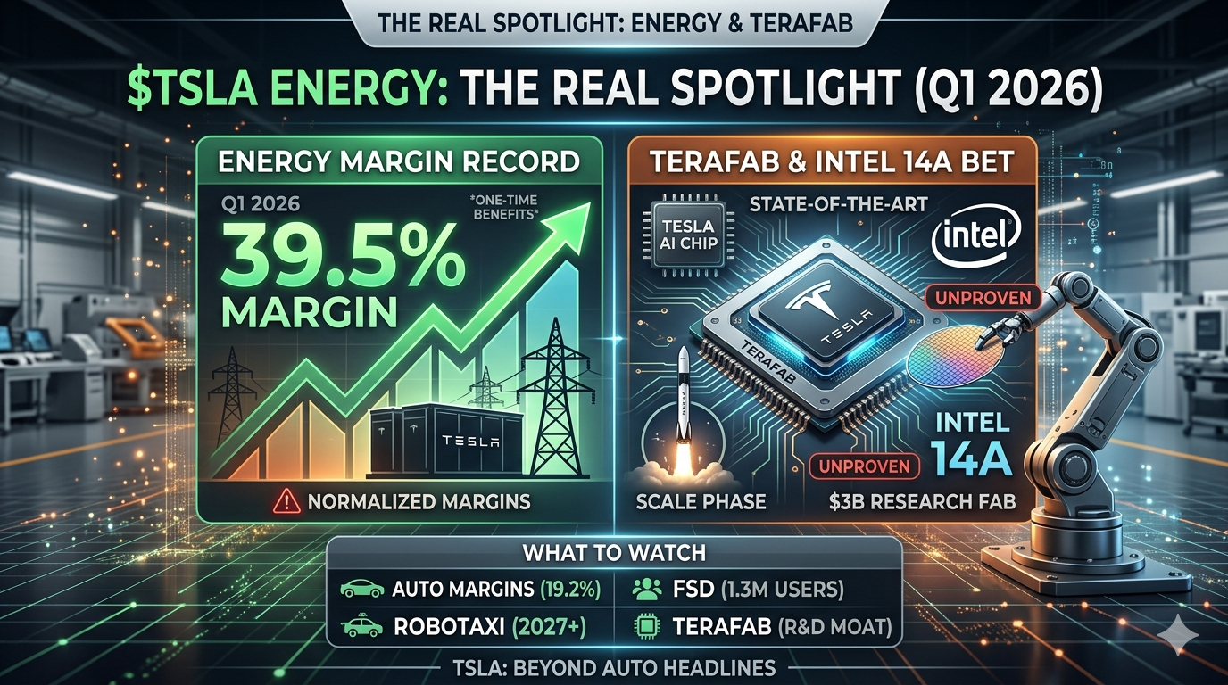 April 22 Q1 2026 earnings dropped. Auto got the headlines, but the real story? Energy margins hit a record 39.5%, and $Tesla Motors(TSLA)$ revealed a $3B $Intel(INTC)$ 14A chip bet called Terafab. Here's what management actually said โ and what it could mean for the stock.