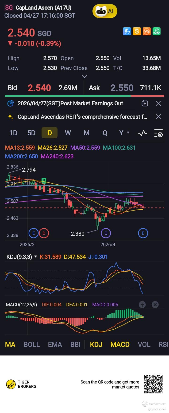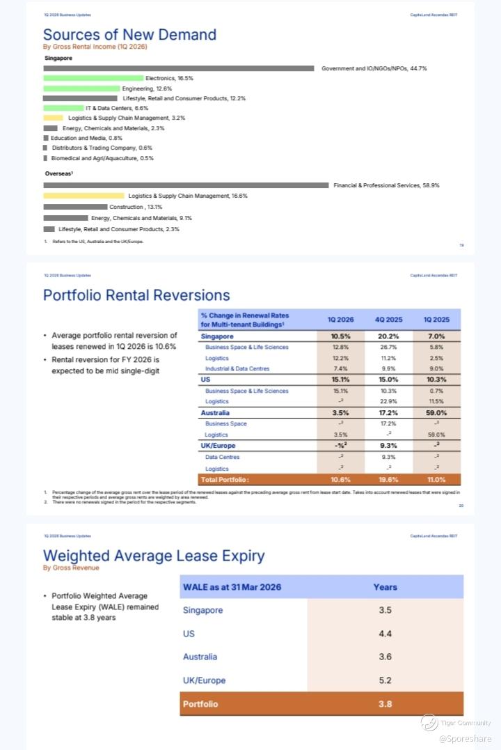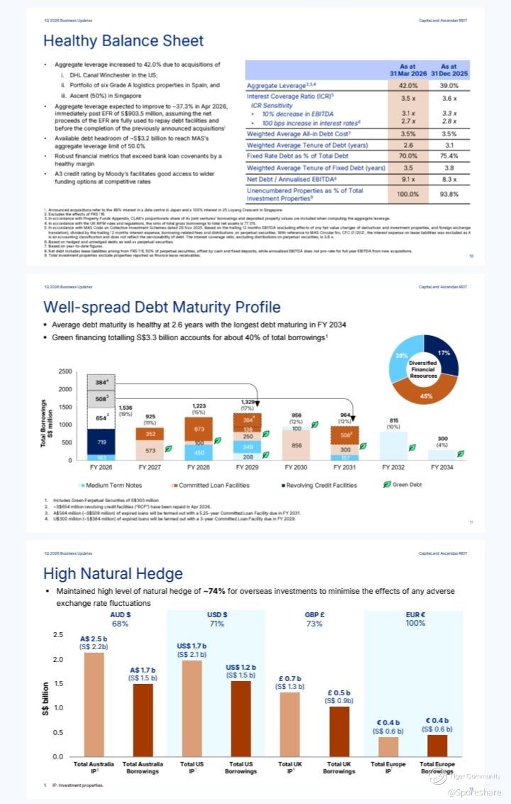 CLAR: CapitaLand Ascendas REIT - 1st quarter results update is out.Positive rental reversion of 10.6 percent. Occupancy rate of 90.5 percent. ICR 3.5x. Accretive acquisitions of 1.6b. NPI yield of min 4.3 percent. Gearing will decrease from 42 to 37.3 percent in April 2026.