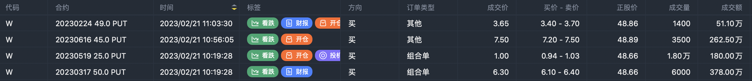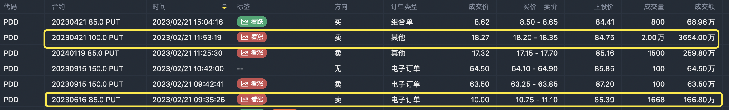 這行權價,這到期日,信息量是不是很大?信息量更大的是,盤中有一張總成交額爲3654萬的大單: $PDD 20230421 100.0 PUT$