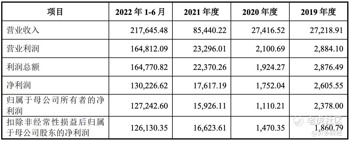 2019年、2020年、2021年和2022年上半年,九嶺鋰業的營收分別爲2.72億元、2.74億元、8.54億元和2.18億元;淨利潤分別爲2605.55萬元、1752.04萬元、1.76億元和1.30億元,扣非後淨利潤分別爲1860.79萬元、1470.35萬元、1.66億元和1.26億元。