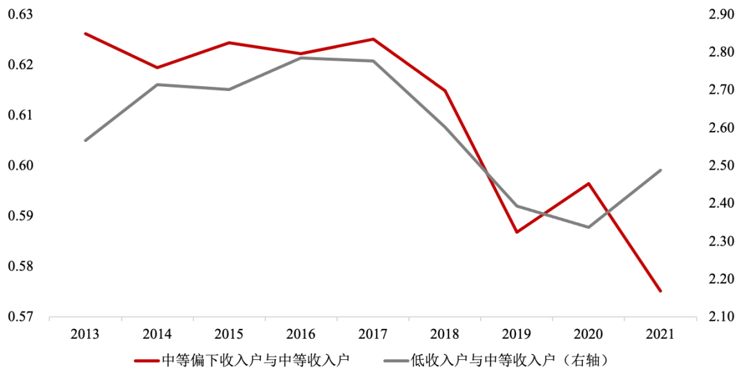一方面,共同富裕縮小兩極分化,助力消費增加。不同學者(例如,Deaton和Muellbauer(1980),Tachibanaki和Imayama(1999),Lu和Lau(2015),Siami-Namini(2017)等)基於幾乎理想系統(Almost Ideal Demand System,AIDS)模型通過對三十多個國家或地區(例如,美國、歐洲、日本、東南亞等)的面板數據研究均發現,這些國家或地區的家庭居民部門可支配收入與消費行爲存在顯著相關性,並根據對不同收入組別與組間差距的分析,指出收入差距減少將有效提升消費水平。2022年中國居民人均可支配收入爲36883元,根據中國國家統計局劃分的五組收入情況看:中等收入、中等偏下收入羣體以及低收入羣體2022年人均可支配收入則分別爲29053元、18445元、8332元,而這一區間內的人口規模約8.5億,其中中等偏下收入羣體與低收入羣體約5.6億。基於歷史數據,低收入人羣、中低收入人羣與中等收入人羣的差距呈現逐年縮小的態勢,相信這樣的趨勢可以繼續保持,而6-8億人收入水平的提升,其邊際消費傾向的變化將高於高收入人羣,從而推動整體消費傾向的增加。不僅如此,未來中國居民收入結構將呈現收入羣體向上躍遷與中等收入羣體擴大的結構性變化,使得中國中等收入羣體的規模有效擴大,也只有中等收入羣體擴大了以後,才能夠更有效地擴大中國的消費。