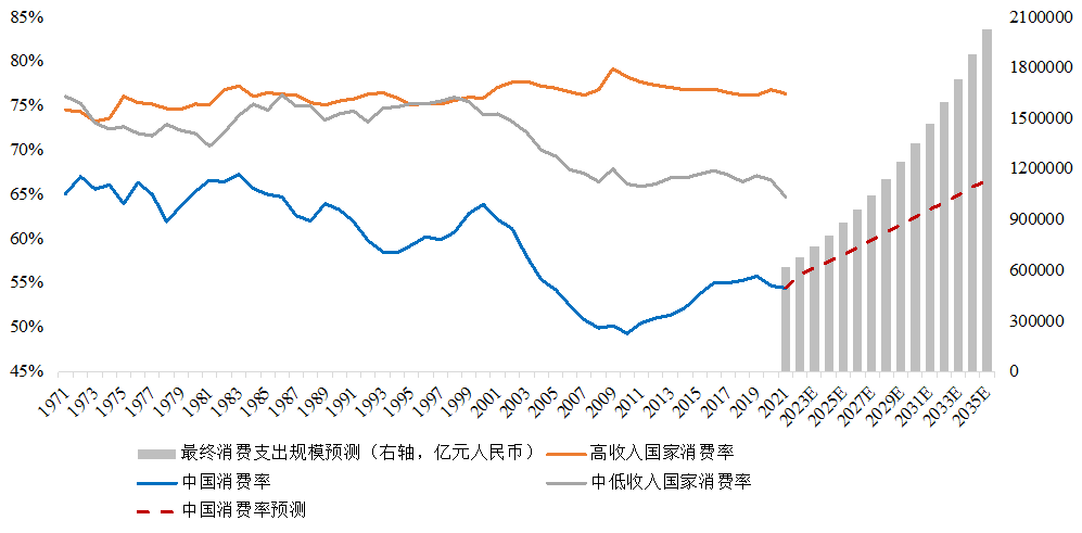 從人均GDP來看,2021年中國人均名義GDP折算1.26萬美元,預計在2025年有望達到1.59萬美元,並在2030年或達到2萬美元 。人均GDP的提升使得居民可支配收入同步上行,最終導致消費支出增加。以消費率(即最終消費佔GDP的比重)爲衡量標準,縱觀全球,基本上呈現中高收入國家消費率高於中低收入國家的趨勢,也就意味着隨着人均GDP的增加,最終消費佔GDP的比重也會隨之上行並維持穩定。World Bank數據顯示2021年中高收入國家消費率爲76.4%,而中低收入國家消費率爲64.7%。