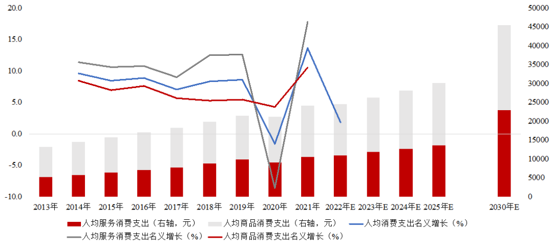 基於服務商品消費數據可以發現,人均服務消費支出佔消費總支出比重呈逐年上升趨勢,從2013年的39.7%升至2019年的45.9%;2020-2021年因疫情導致比重下滑,但仍在42%以上。疫情前(2014-2019年),人均服務消費支出名義平均增速11.2%高於人均消費總支出平均增速約2.7個百分點,2020-2021年人均服務消費支出兩年複合名義增速3.8%,低於歷史中樞以及同期消費總支出複合增長水平5.7%,主要是因爲疫情期間服務消費場景受阻導致服務消費數量的大幅下滑,兩年複合實際增速爲2.7%,疊加服務消費價格增速也有所下行。隨着疫情干擾減弱,服務消費比重上升的歷史趨勢仍將延續,到2030年之後有望升至50%或以上,實際增速有望超過3%並向歷史實際增速中樞靠攏,加之溫和的物價上漲,服務消費仍有潛力保持較快的加速增長。