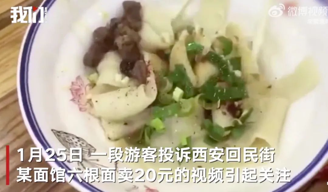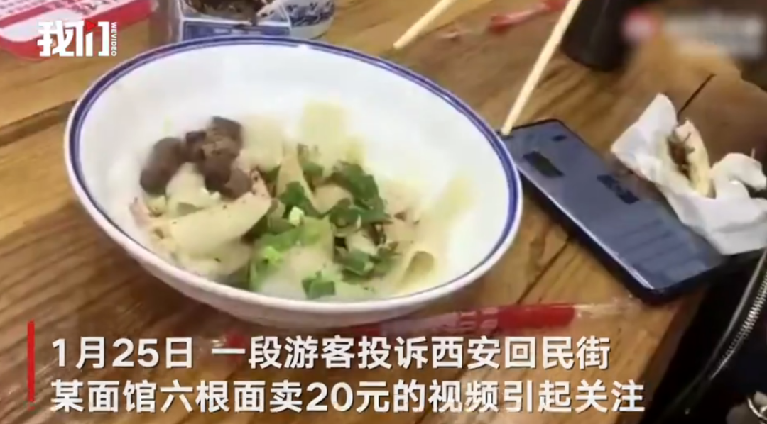 據新京報“我們視頻”報道,1月25日,一段遊客投訴西安回民街某面館6根面賣20元的視頻引關注。