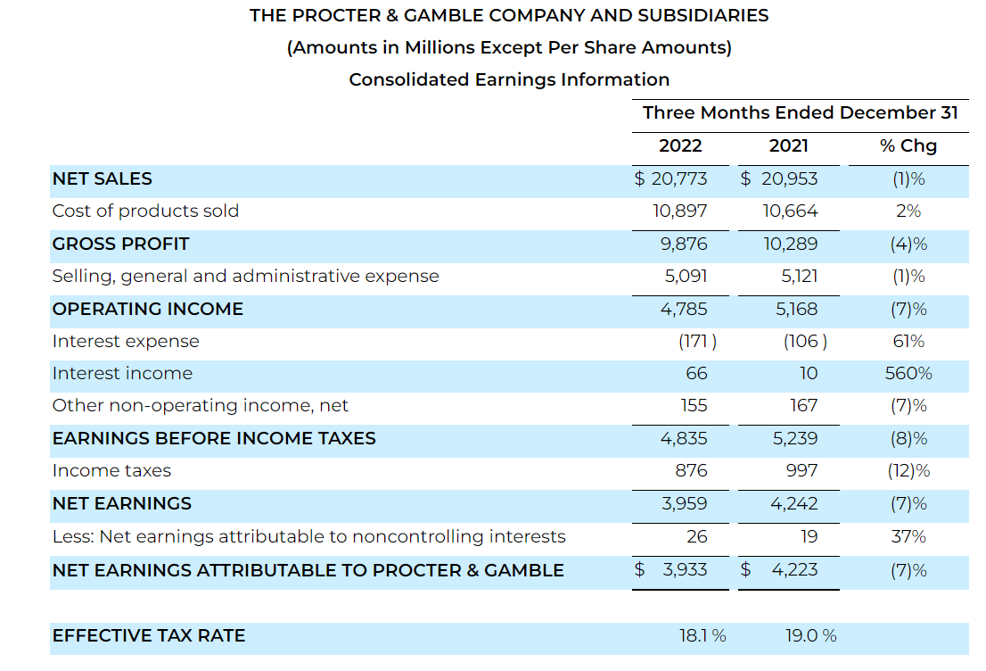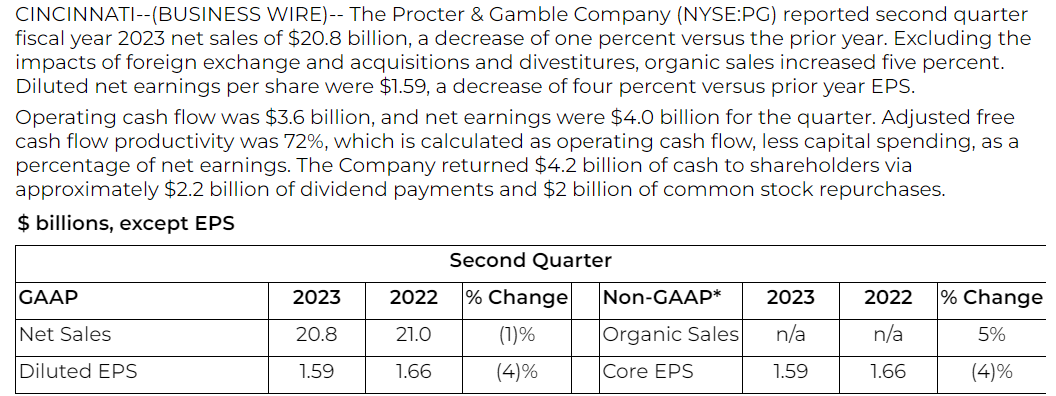 1月19日,寶潔盤前發佈財報,財報顯示:第二季度銷售淨額208億美元,預估207.4億美元,同步下降1%;第二季度核心每股收益1.59美元,預估1.60美元。