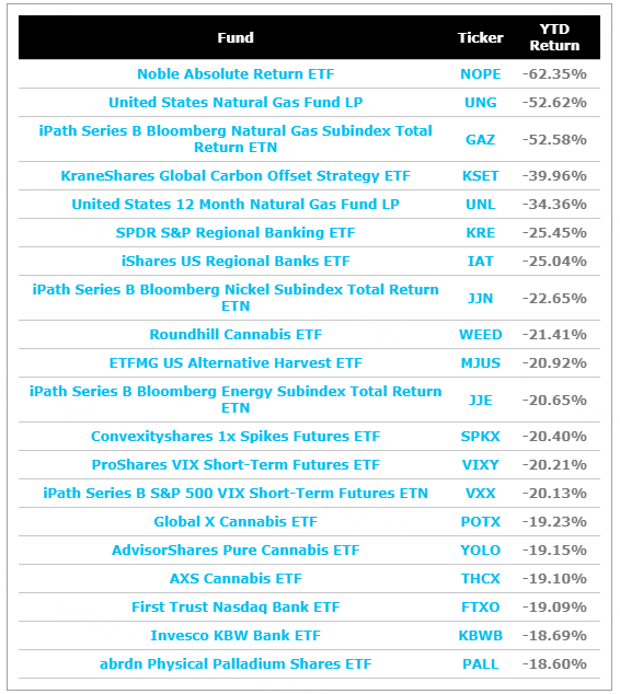 Noble Absolute Return ETF (NOPE)表現最差。這隻 ETF 中的對衝基金去年底對特斯拉、黃金和比特幣進行了一些不合時宜的押注,導致該基金到 2023 年迄今損失高達 62%。