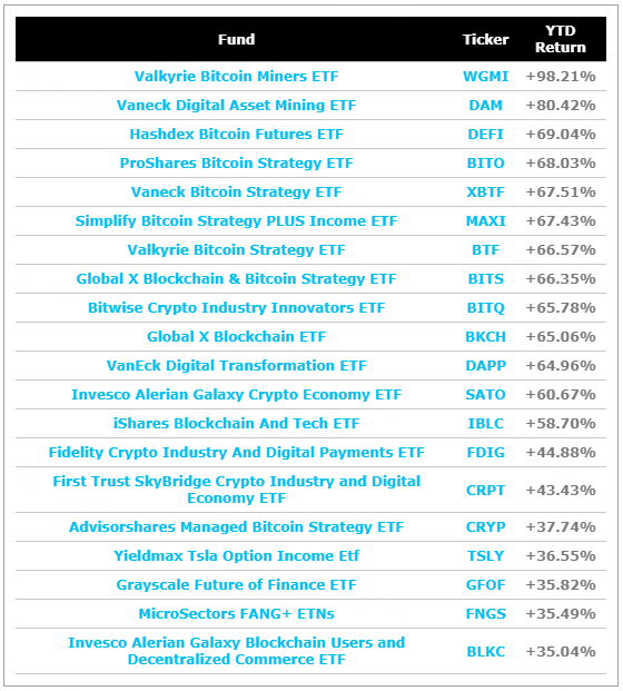 其中包括 Valkyrie Bitcoin Miners ETF (WGMI) ProShares Bitcoin Strategy ETF (BITO) Bitwise Crypto Industry Innovators ETF (BITQ),它們的漲幅均超過 65%。