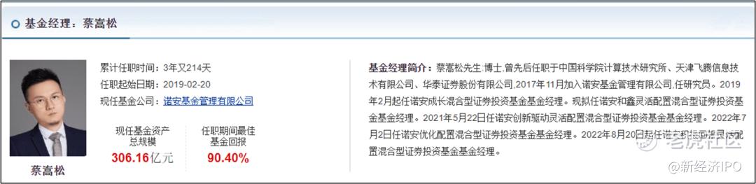 公開信息顯示,蔡嵩鬆主要管理3只基金,分別是規模266.36億元的諾安成長混合(320007)、規模35.79億元的諾安和鑫靈活配置混合(002560)、規模約3.3億元的諾安創新驅動(混合A+混合C)。截至目前,蔡嵩鬆管理的基金總規模約306億元。