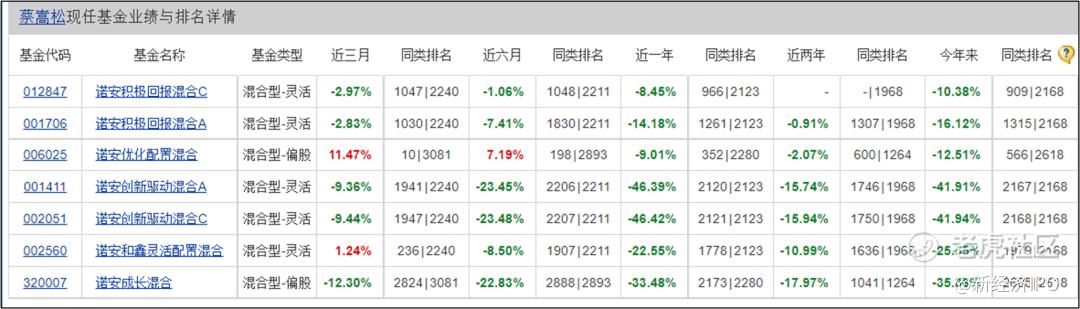 不過,過去兩年,蔡嵩鬆的業績都非常慘淡。以諾安成長混合(320007)爲例,今年以來下跌了35.36%,近兩年下跌18%,在2618只基金中排名倒數13名,妥妥的學渣中的學渣;諾安創新驅動更慘,今年淨值暴跌42%,在同類基金排名中倒數第二!諾安和鑫今年淨值下跌近25%,近兩年淨值下跌11%,在2168只基金中排名1979,也是排名最後10%的學渣了。