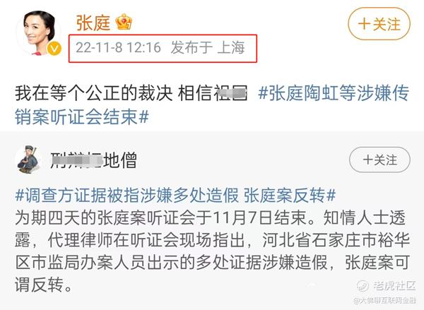 而11月的這次聽證會,張庭夫婦一口氣請了30個代理律師爲其發表陳述意見。在聽證會結束第二天,張庭還發了圍脖,表示等個公證的裁決,IP地址顯示爲上海。