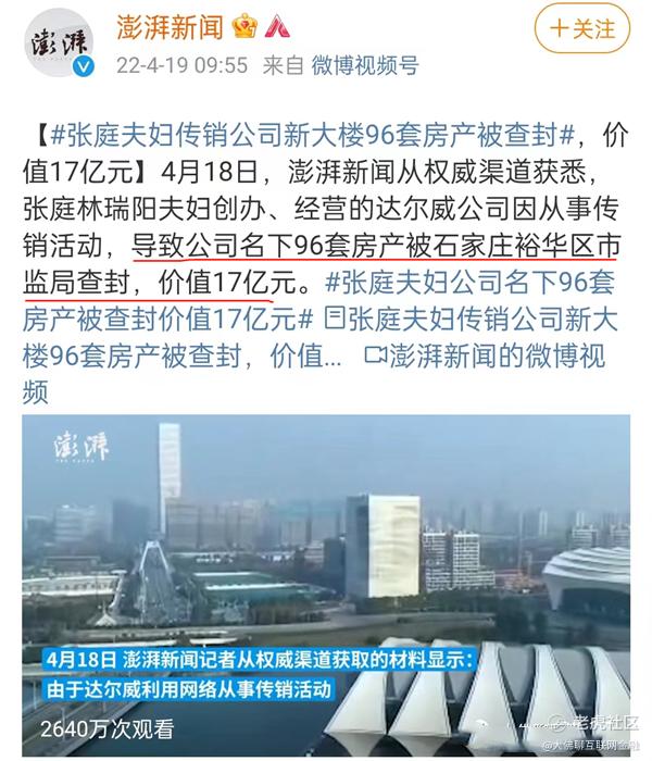 2021年12月,張庭夫婦旗下公司因涉嫌傳銷被立案調查,當時被凍結資金6億元。