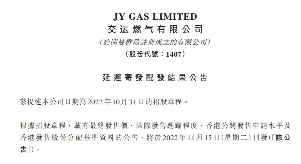 11月15日消息,港交所官網顯示,$交運燃氣(01407.HK)$發佈延遲寄發配發結果公告。