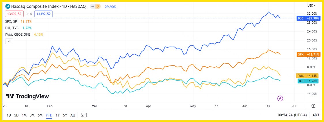 From the YTD chart below, we can see The $NASDAQ(.IXIC)$ rose over 32% by mid-June, and $S&P 500(.SPX)$ 's 2023 rise reached almost 16% in mid-June before the latest pullback of the past week.