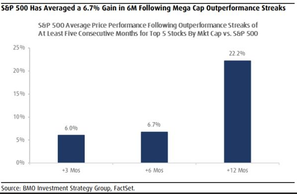 • Based on historical data, once mega-cap out-performance streaks historically, the $S&P 500(.SPX)$ has averaged a 6.7% gain in the six months following.