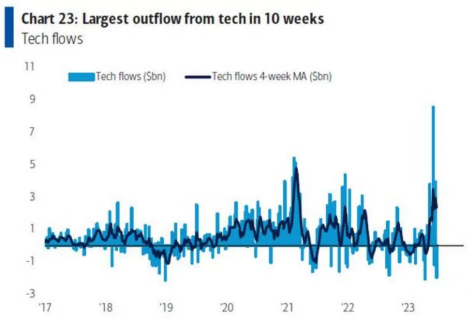 • Technology stocks has also begun to see profit outflows. Outflows from tech stocks hit $2 billion in the week ended Wednesday, the most in the past 10 weeks, according to EPFR Global.