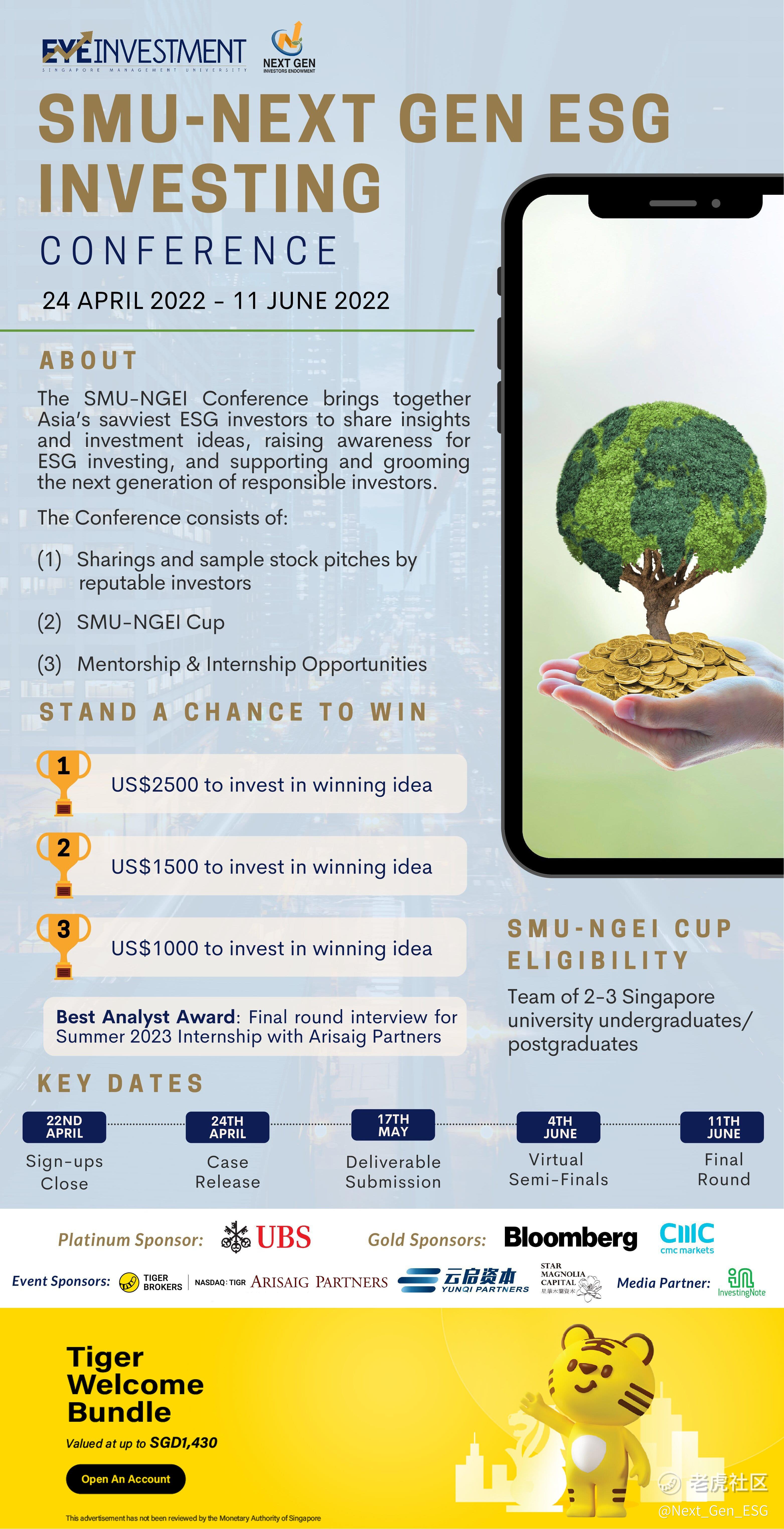 Next Gen Investors Endowment Ltd. and SMU EYE Investment Club are proud to present the SMU Next Gen ESG Investing (SMU-NGEI) Conference, where you will get the chance to participate in the SMU-NGEI Cup (a stock pitch competition), gain Mentorship and Internship Opportunities, and listen to reputable investors share their investment ideas! This event is sponsored by Tiger Brokers.