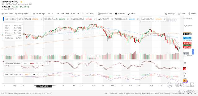 From the technical indicators, the 1D chart of the S&P 500 looks to be hitting bottom soon. The Stochastic seems to have bottomed up and a reversal seems to be in place. The MACD indicator shows that the decline has yet to bottom up and there could be more room to go down. Till the reversal in MACD is completed, I prefer prudence and assume the decline could continue despite the reprieve on Friday (13 May 2022).