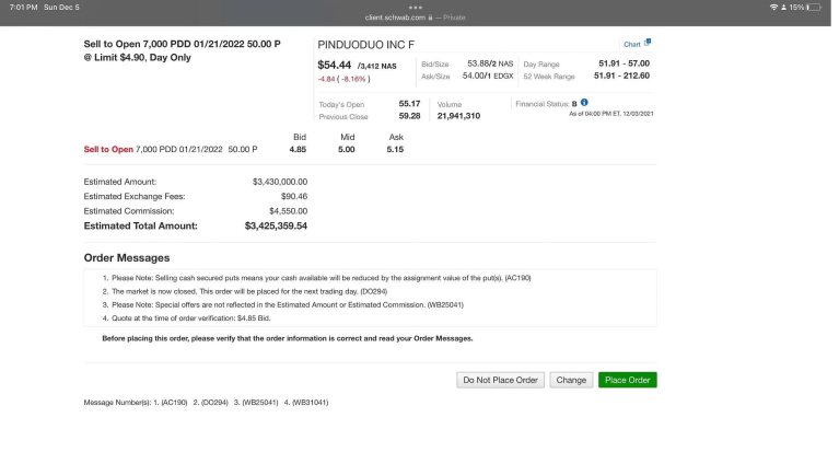 In December 2021, Duan Yongping, known as China's Warren Buffett, traded 7,000 PDD Sell to Open PutOptions. The expiration date is January 22, 2022, with strike price at $50. One PUT containing 100 shares, and a premium of $4.90 per share.