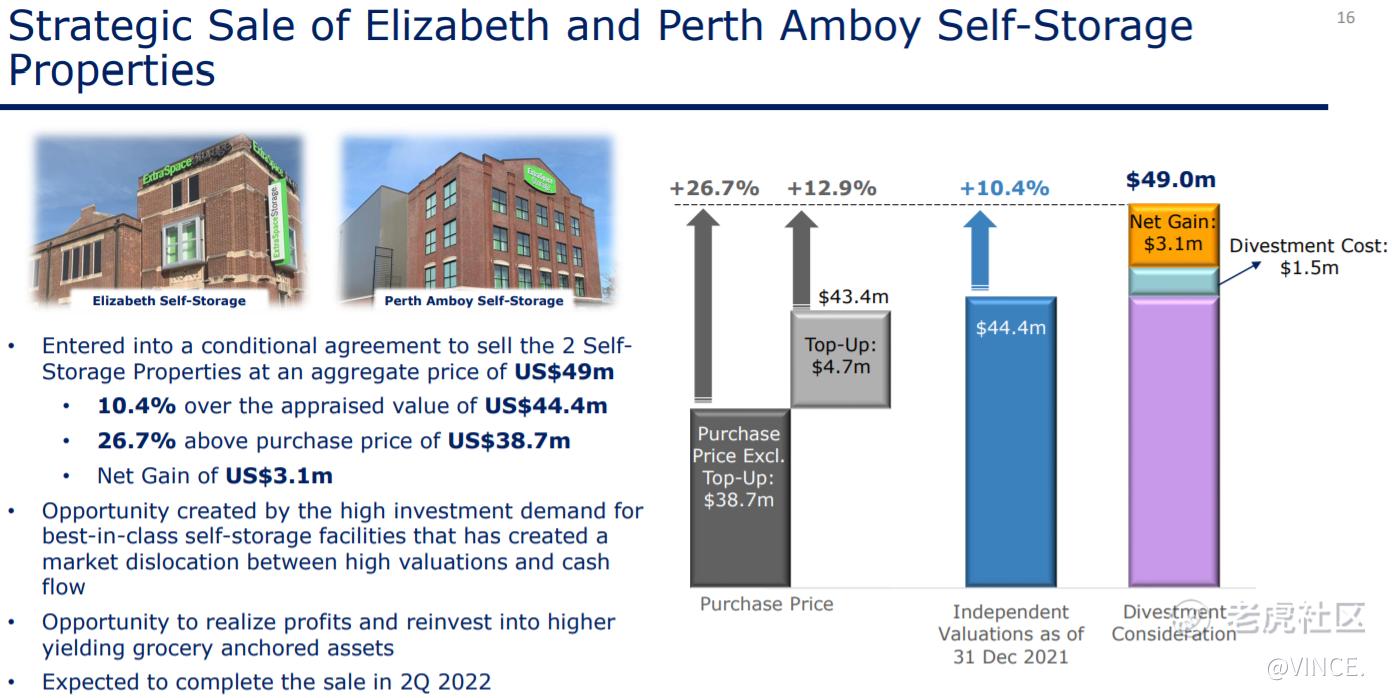 The full half yearly contribution from the 2 newly acquired properties would improve UHREIT performance moving forward. However, it would be offset by loss of income from the divestment of Elizabeth and Perth Amboy self-storage properties which is target to complete by 2Q 2022. Let's see later whether managements would acquire any property after the divestment.