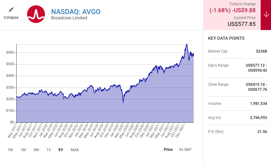 A split would also make sense given that Broadcom's business is firing on all cylinders. Its backlog hit $14.9 billion in 2021, with CEO Hock Tan noting in December that the company's supply was already booked through 2022 and into 2023. Considering that chip shortages are persisting, Broadcom's share price has a very good chance of heading even higher.