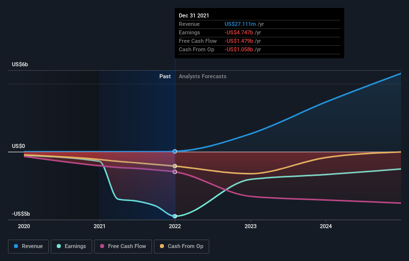 After the downgrade, the six analysts covering Lucid Group are now predicting revenues of US$1.3b in 2022. If met, this would reflect a substantial improvement in sales compared to the last 12 months. The loss per share is anticipated to greatly reduce in the near future, narrowing 57% to US$1.23. However, before this estimates update, the consensus had been expecting revenues of US$2.0b and US$1.12 per share in losses. So there's been quite a change-up of views after the recent consensus updates, with the analysts making a serious cut to their revenue forecasts while also expecting losses per share to increase.