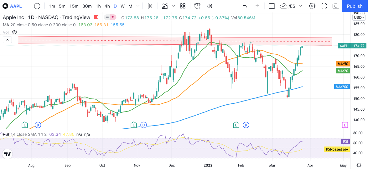 Examining Daily Charts might give clues if $Apple(AAPL)$ and $Tesla Motors(TSLA)$ rally would continue [see pics below]. Prices have risen rapidly and now near resistance levels (red coloured zone based on past price actions). TSLA prices have already consolidate for past three sessions. Other indications, such as distance from MA lines and RSI values gave further datapoints that current rally for both might have run its course. From Technical perspective, more rationale thesis is price will go lower or consolidate here. However, such analysis are not 100%, and sometimes price would continue to rise - stays irrational for much longer.